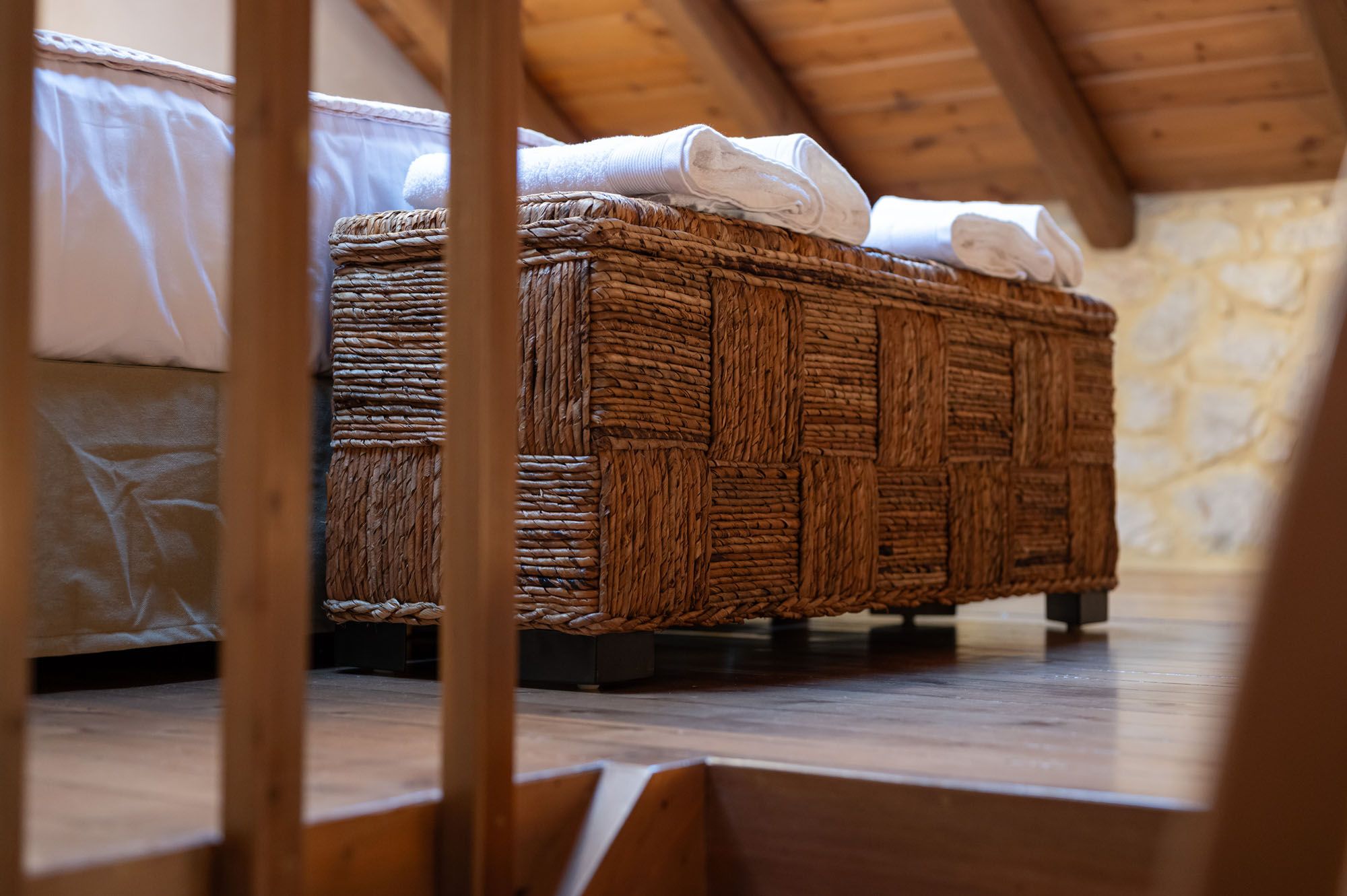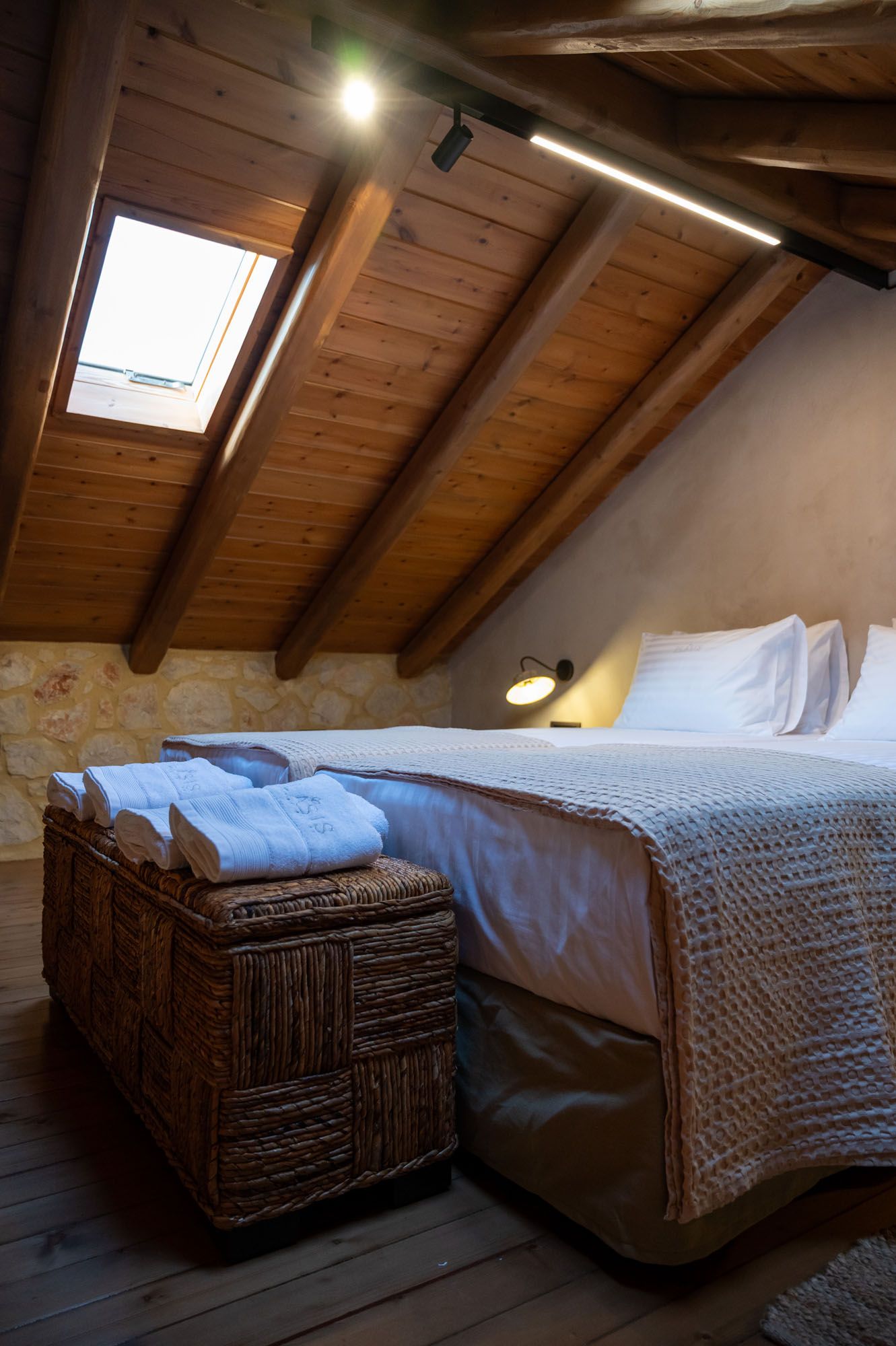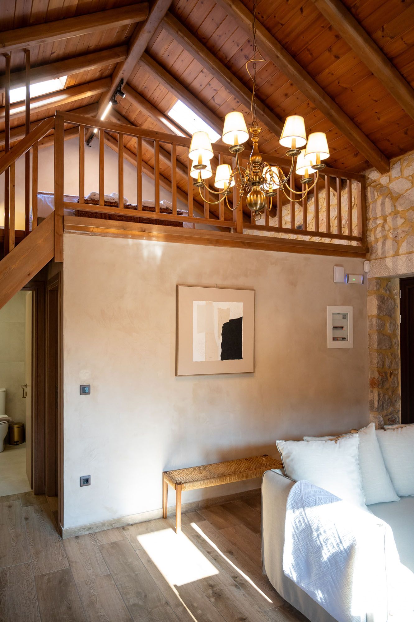 On the ground floor, you’ll find the first bedroom — a bright and welcoming space, where the warmth of traditional design meets modern touches that bring freshness and balance. A wooden staircase leads to the loft, home to the second bedroom: an atmospheric, almost dreamlike hideaway, where a skylight reveals the open sky and lets the morning light gently awaken you — as if nature itself is inviting you to begin again.