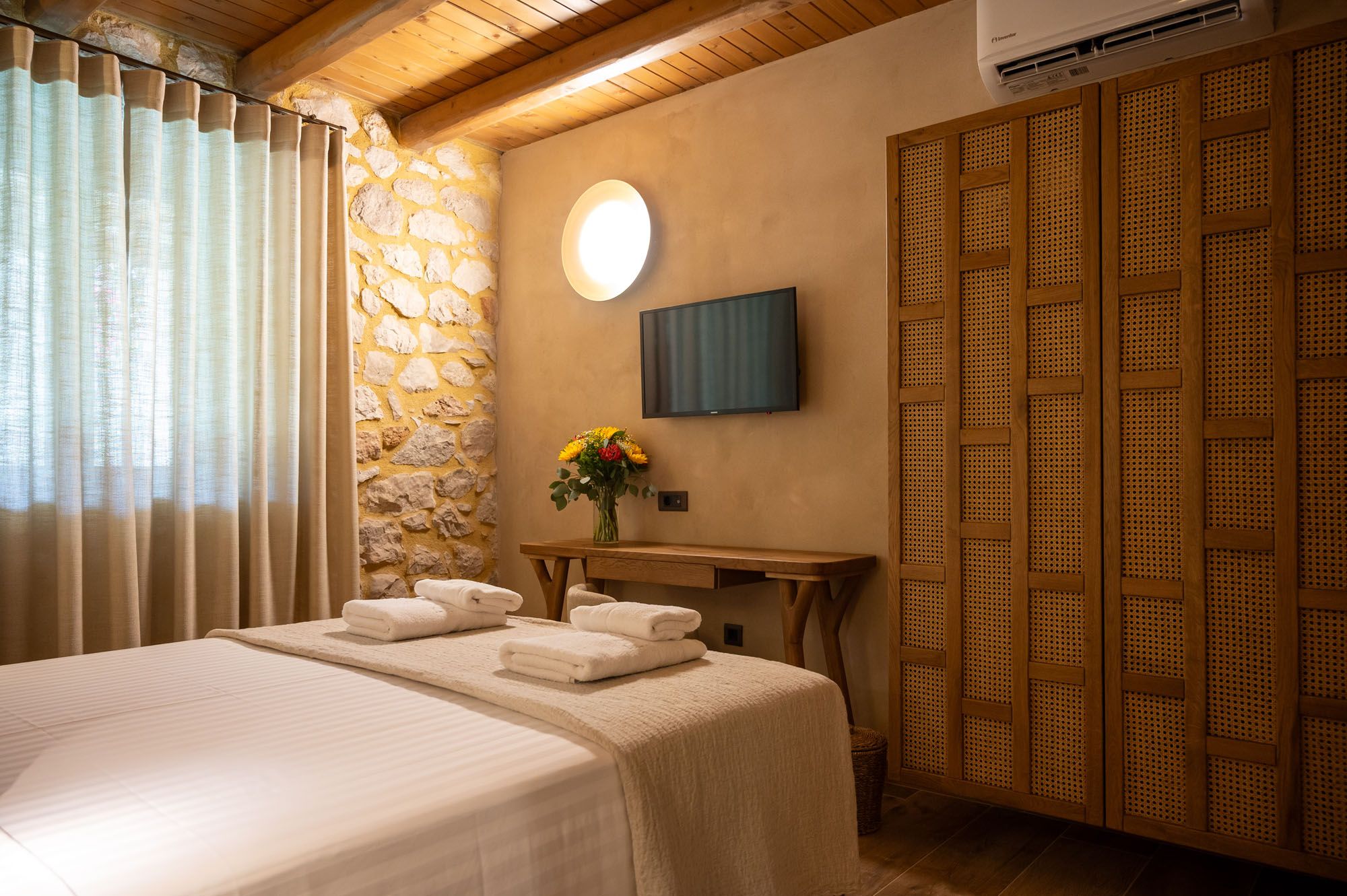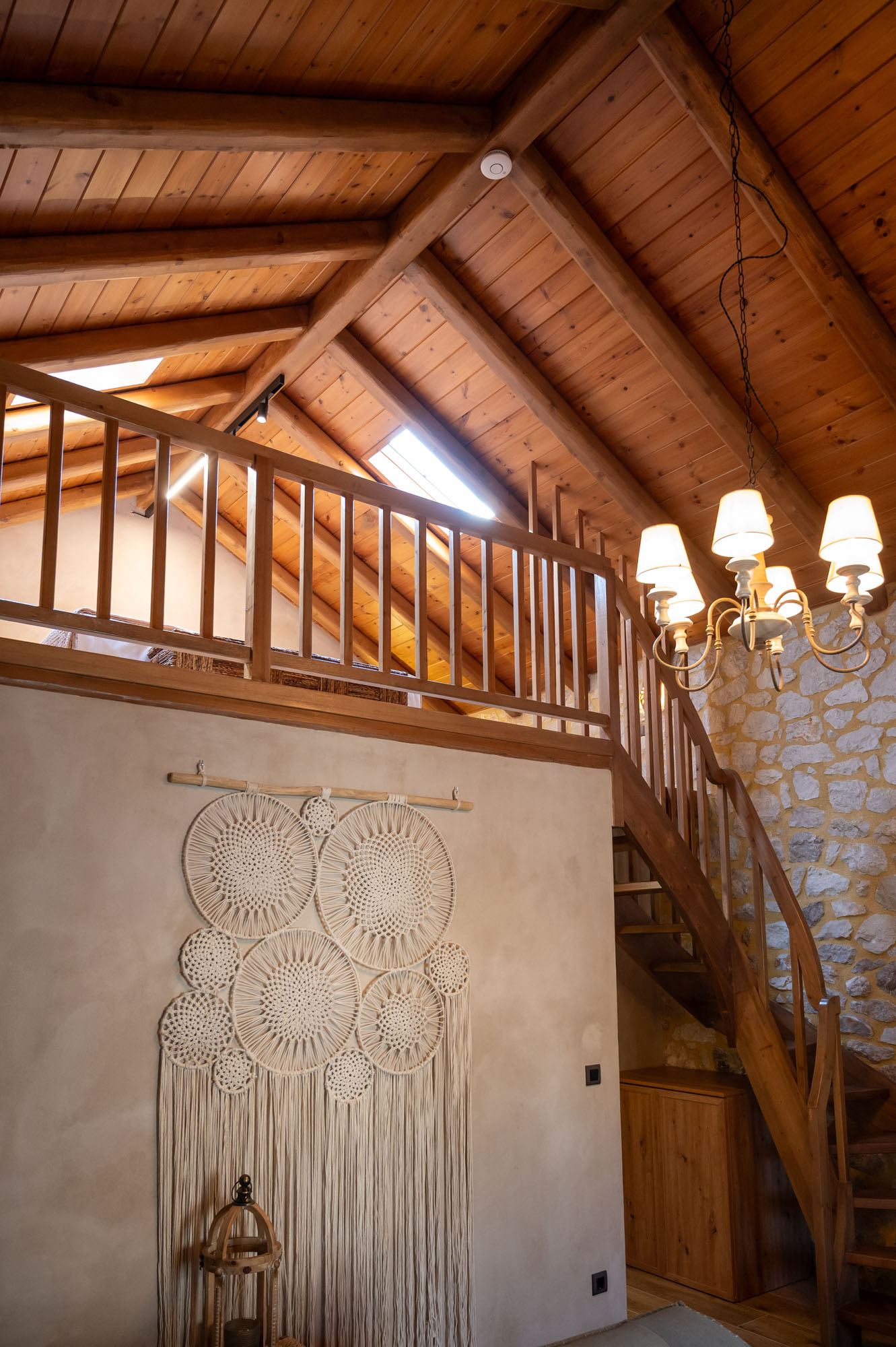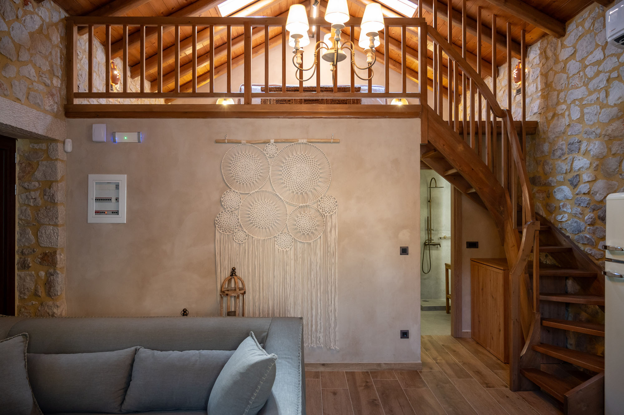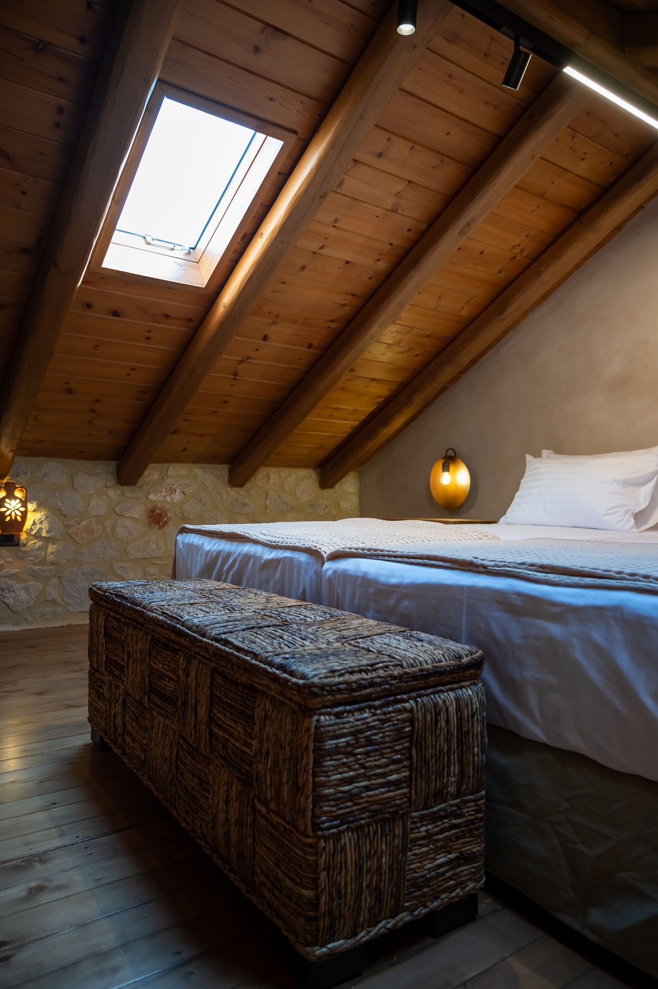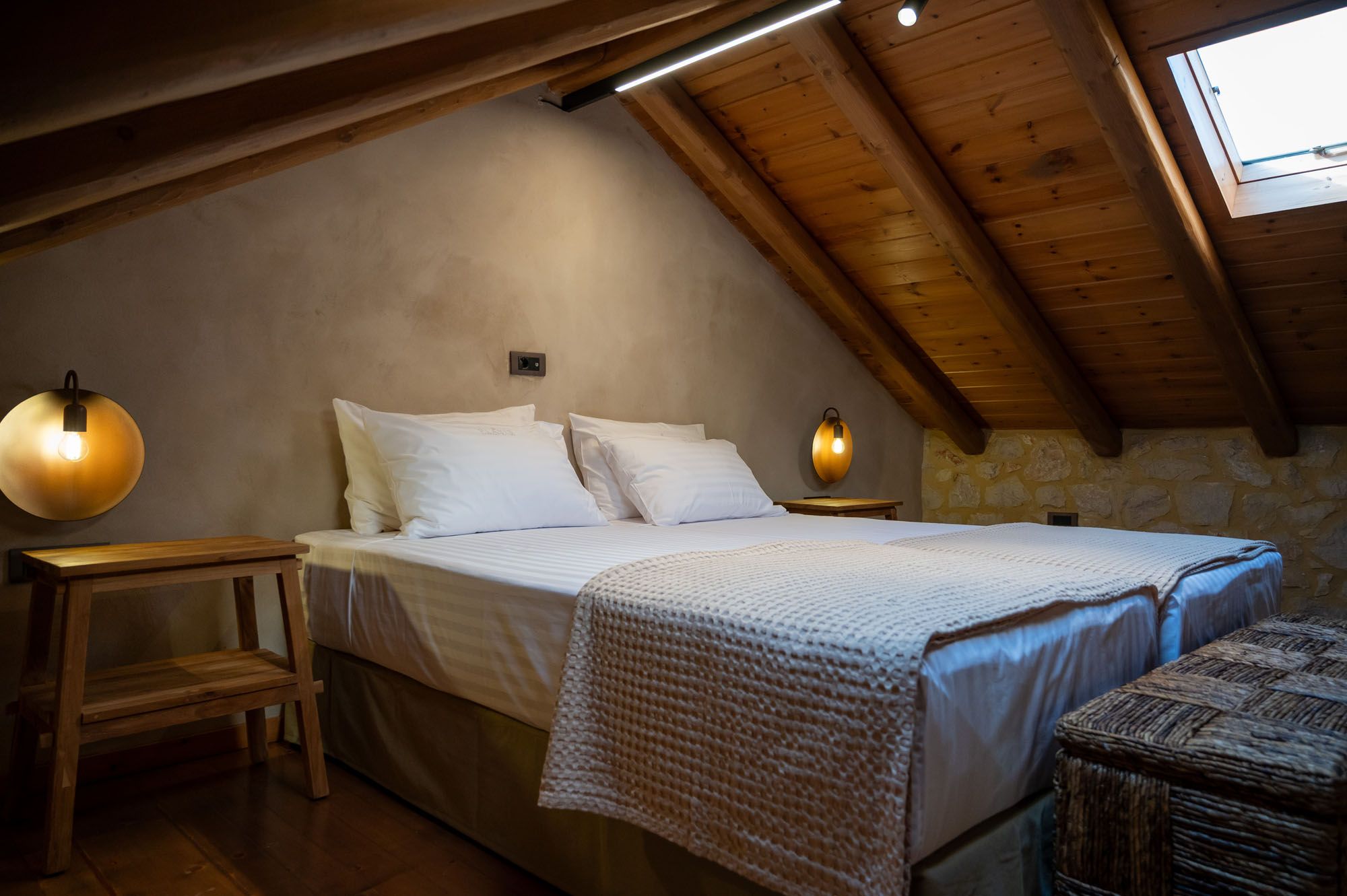 Two bedrooms, one on the ground floor and one in the loft, meet the needs of families or groups while preserving privacy and distinct character. The ground floor bedroom stands out for its warmth and traditional charm, enriched with modern touches that add finesse and brightness. The loft features a minimalist and atmospheric decor with rattan and metal accents, creating a serene space for relaxation and reflection, while the skylight brings the sky inside, allowing natural light to fill the room.