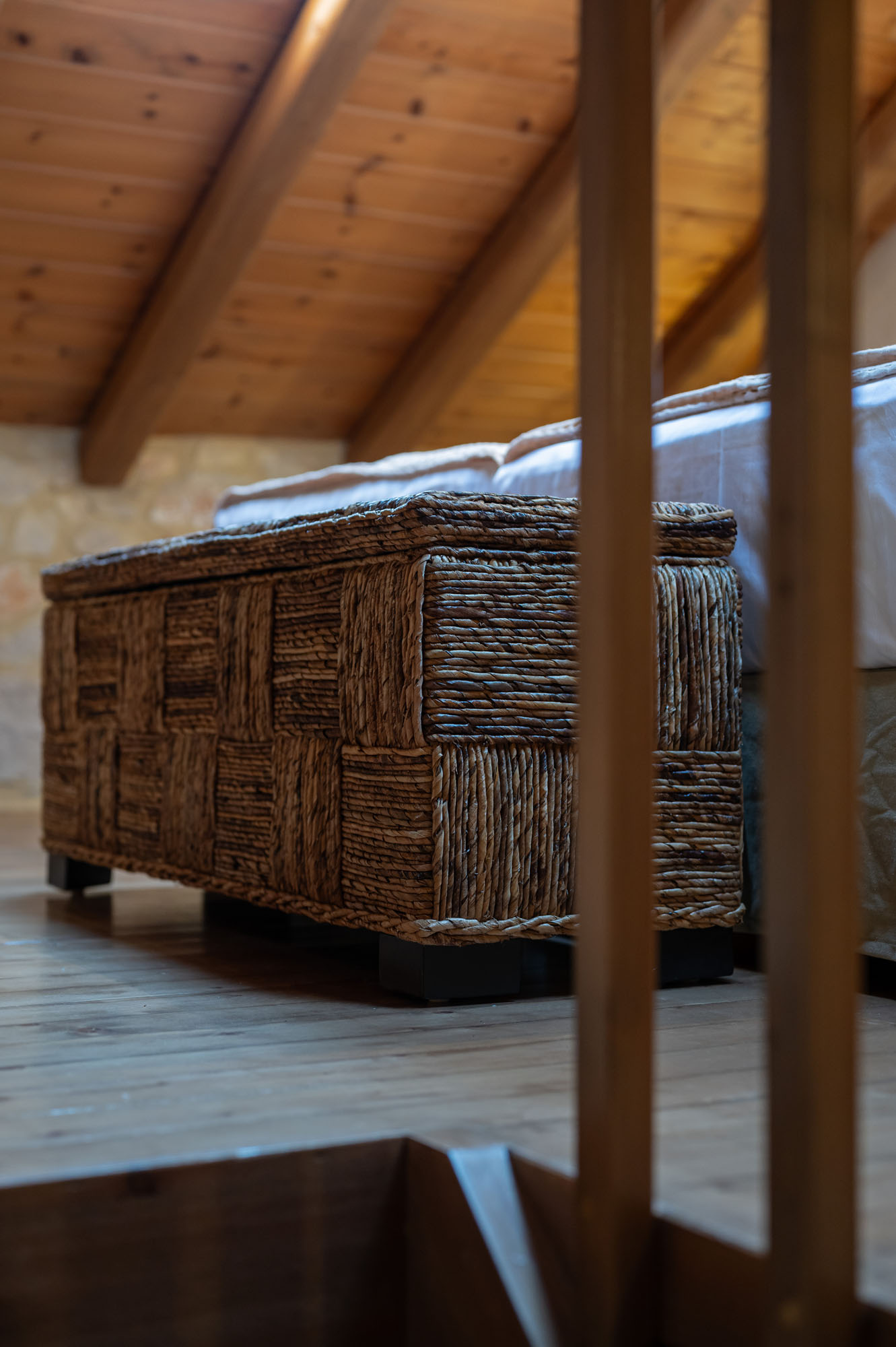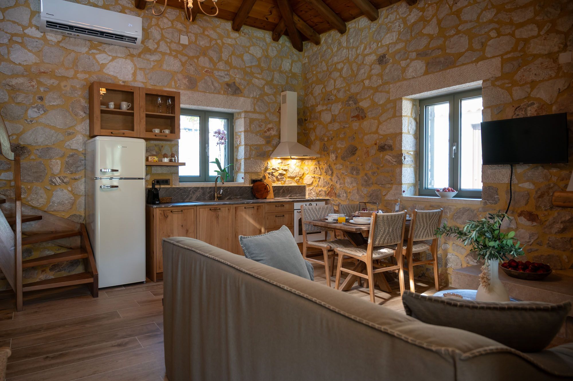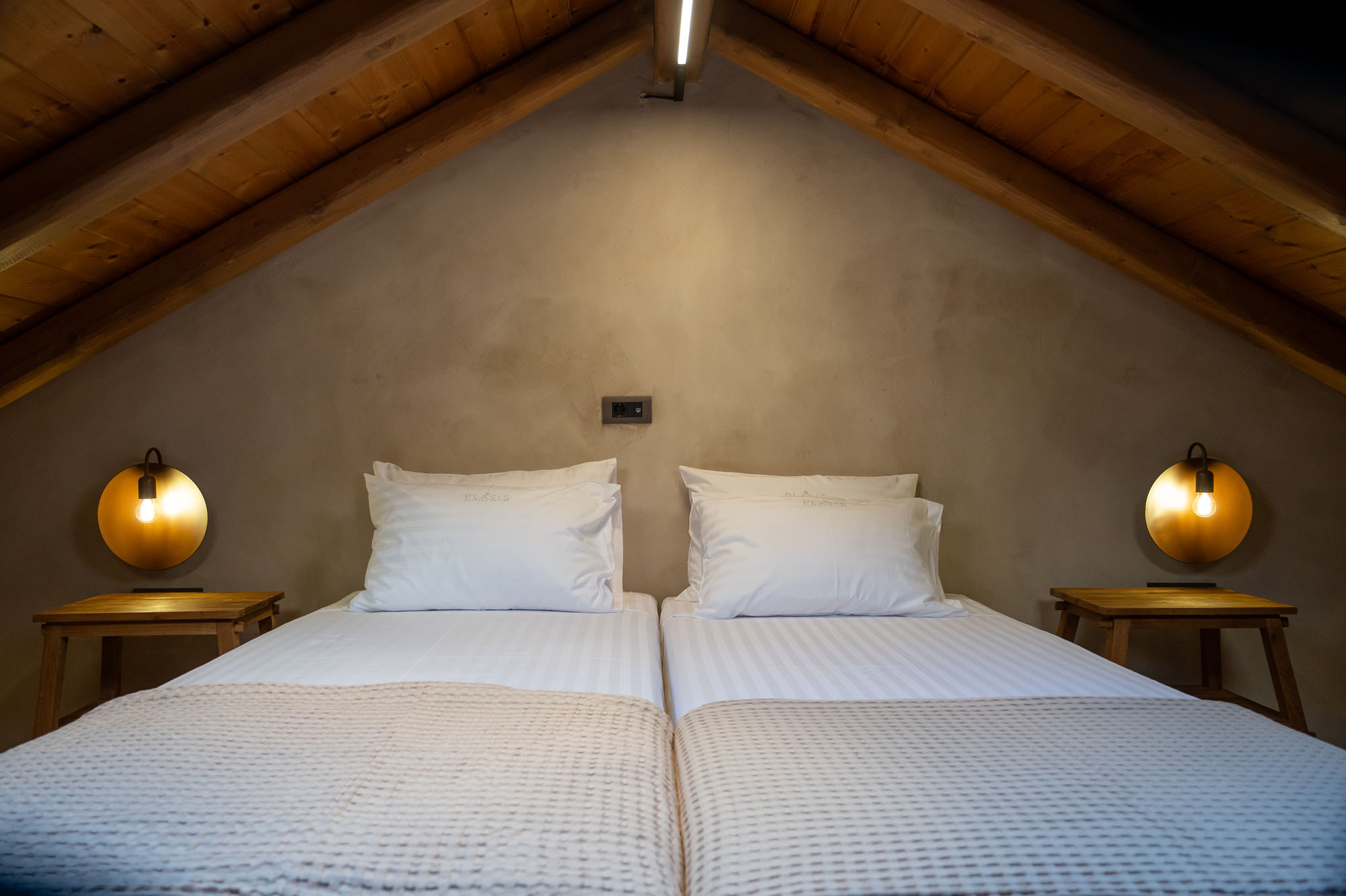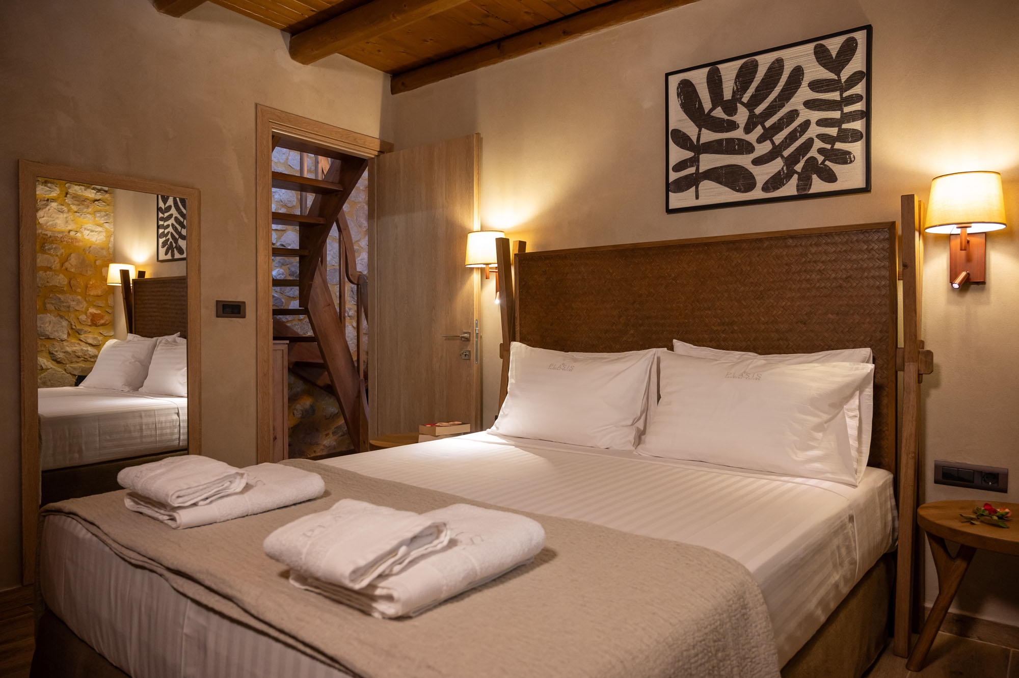 Two bedrooms, one on the ground floor and one in the loft, meet the needs of families or groups while preserving privacy and distinct character. The ground floor bedroom stands out for its warmth and traditional charm, enriched with modern touches that add finesse and brightness. The loft features a minimalist and atmospheric decor with rattan and metal accents, creating a serene space for relaxation and reflection, while the skylight brings the sky inside, allowing natural light to fill the room.