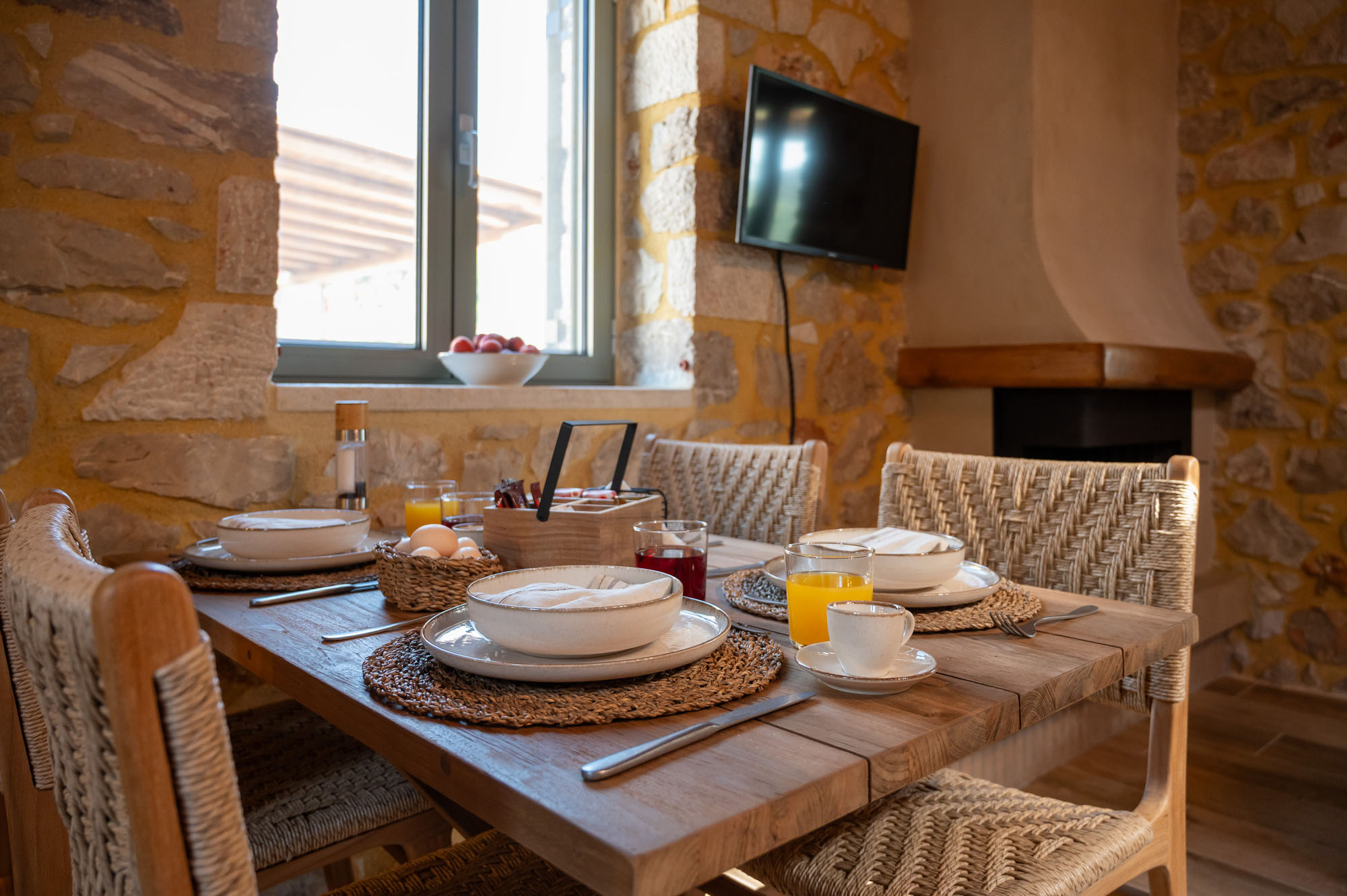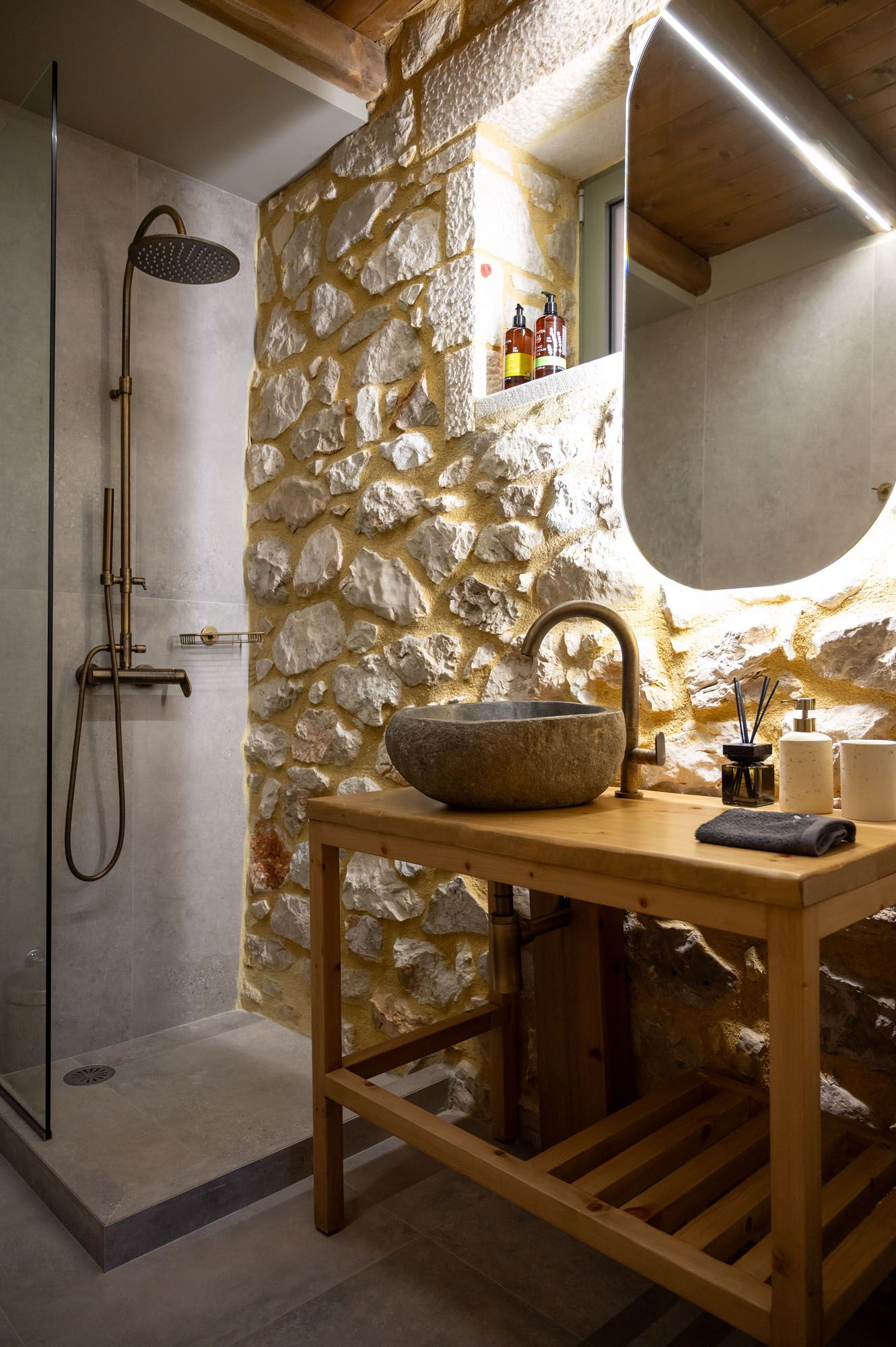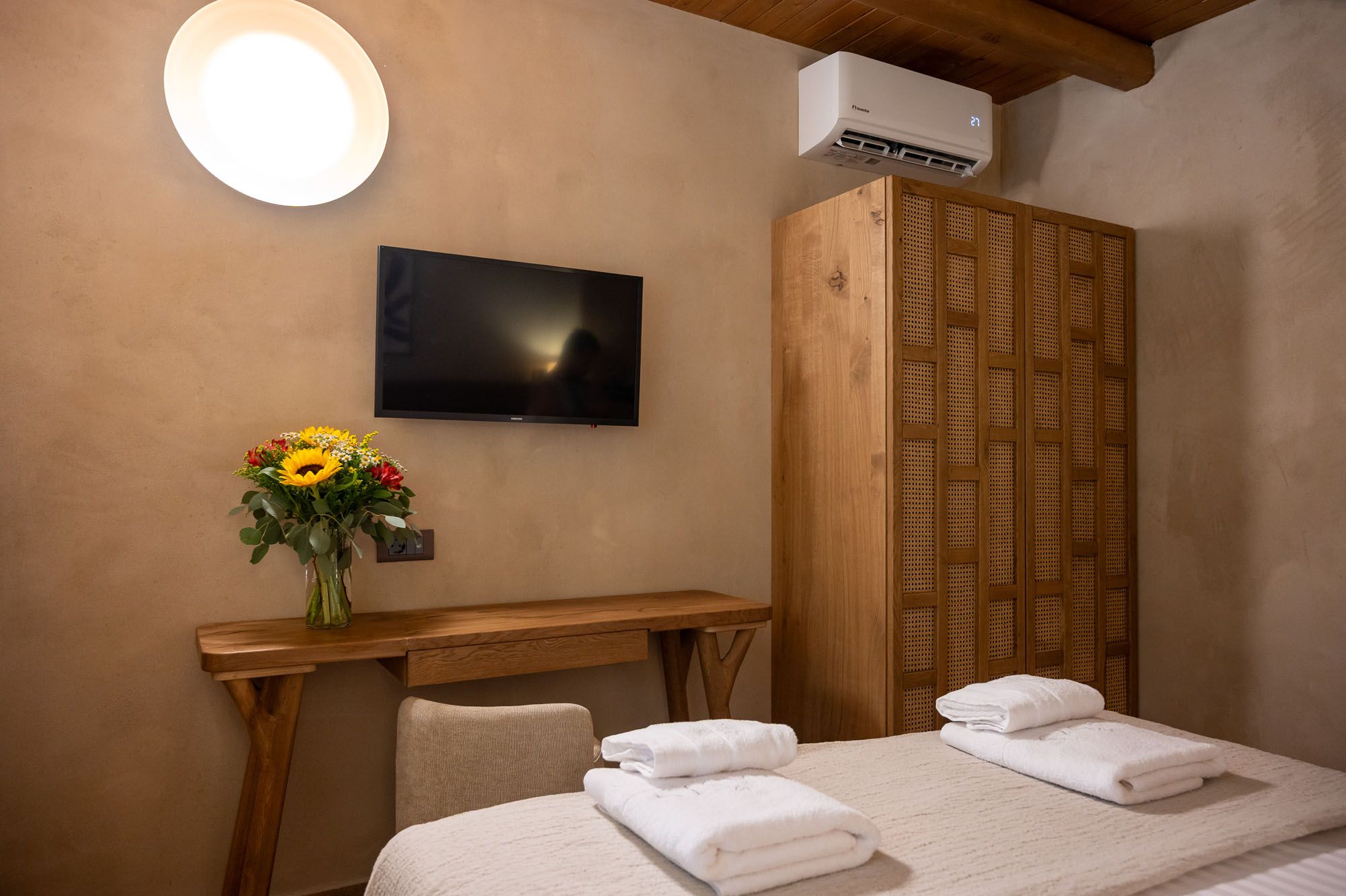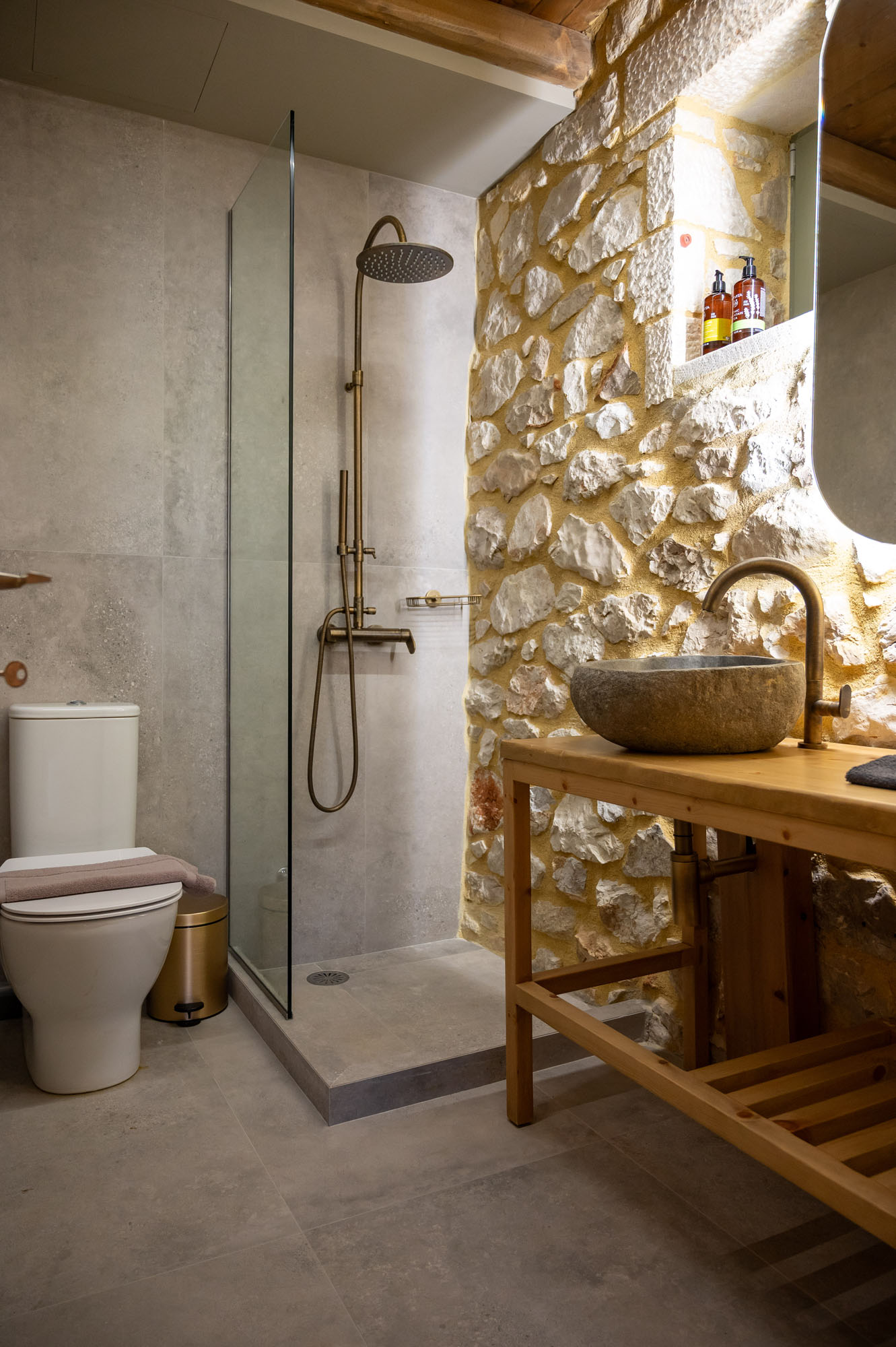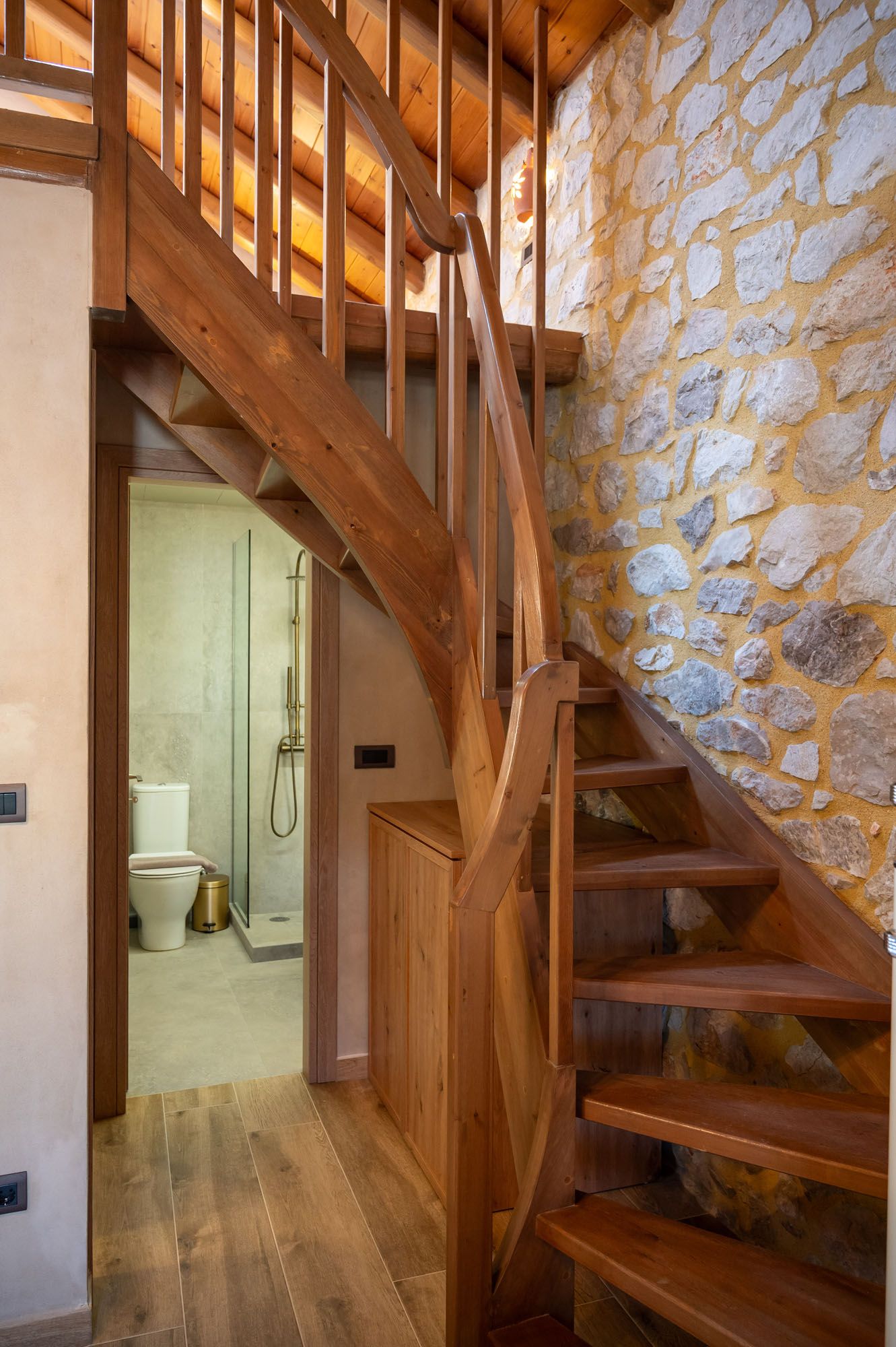 Two bedrooms, one on the ground floor and one in the loft, meet the needs of families or groups while preserving privacy and distinct character. The ground floor bedroom stands out for its warmth and traditional charm, enriched with modern touches that add finesse and brightness. The loft features a minimalist and atmospheric decor with rattan and metal accents, creating a serene space for relaxation and reflection, while the skylight brings the sky inside, allowing natural light to fill the room.