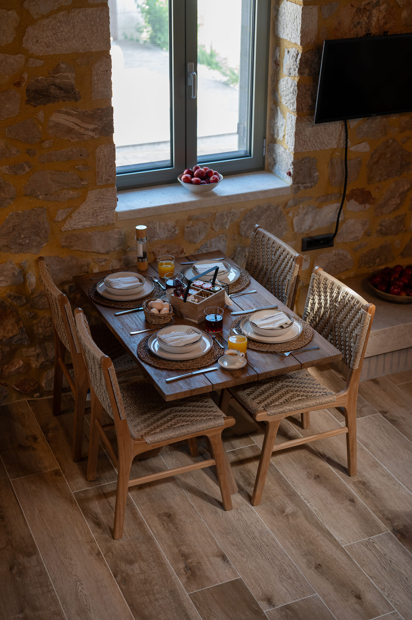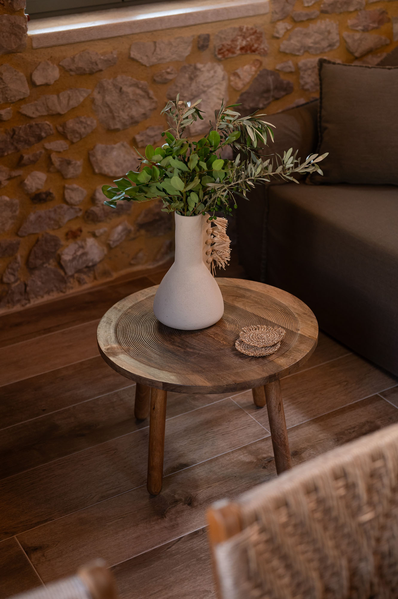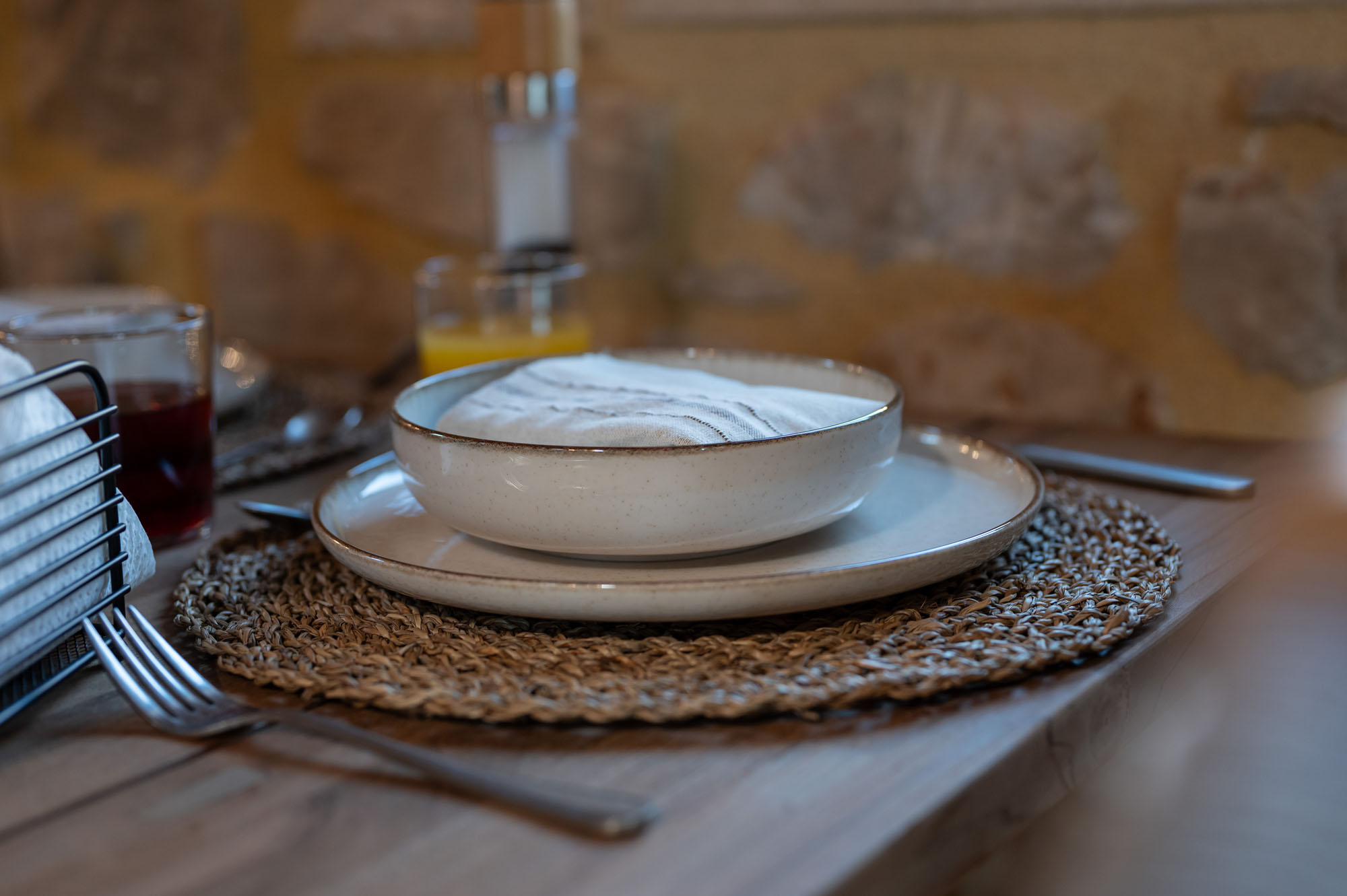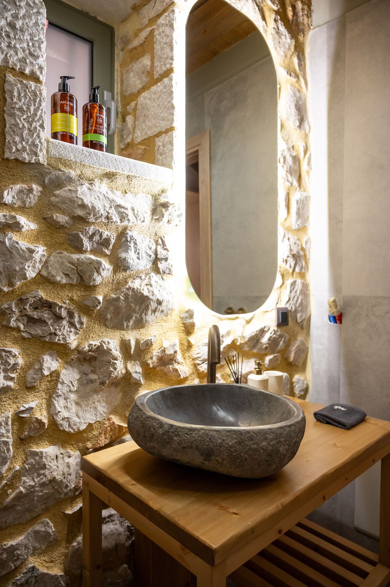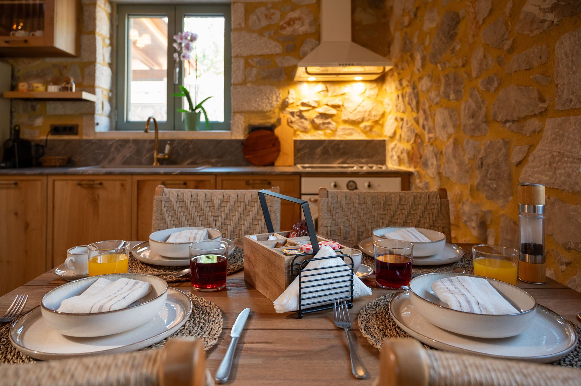 Two bedrooms, one on the ground floor and one in the loft, meet the needs of families or groups while preserving privacy and distinct character. The ground floor bedroom stands out for its warmth and traditional charm, enriched with modern touches that add finesse and brightness. The loft features a minimalist and atmospheric decor with rattan and metal accents, creating a serene space for relaxation and reflection, while the skylight brings the sky inside, allowing natural light to fill the room.