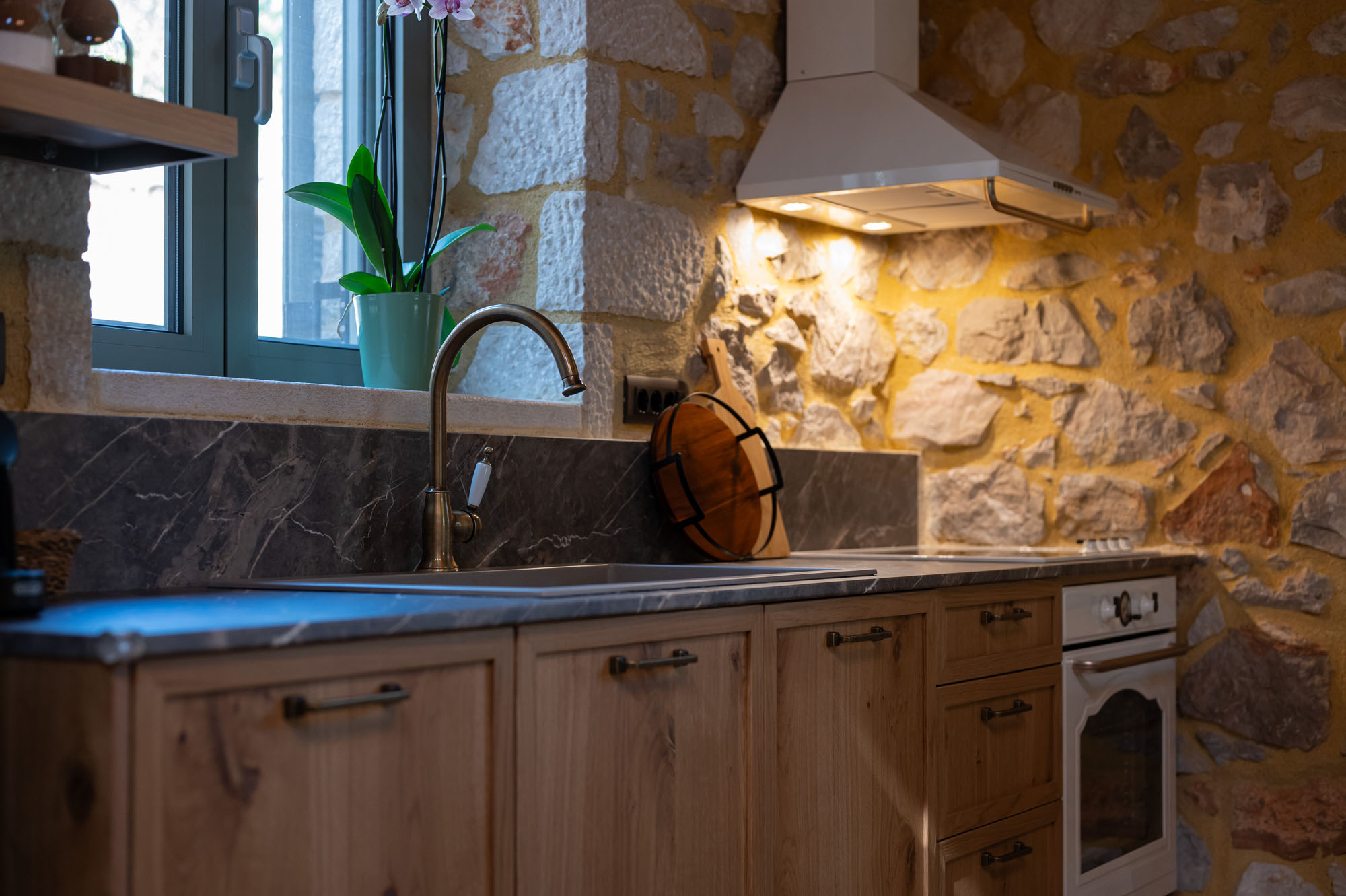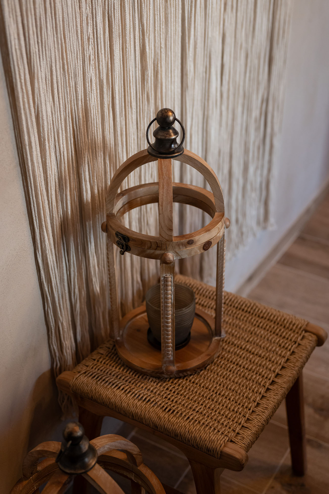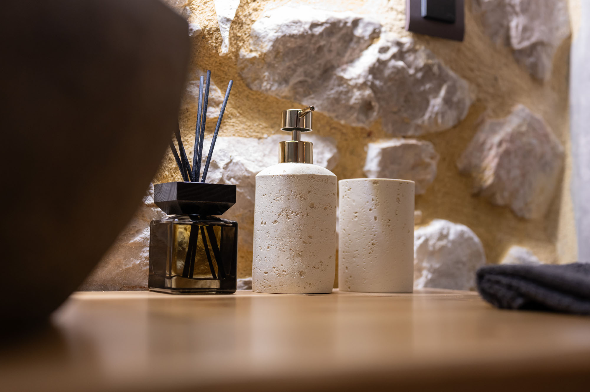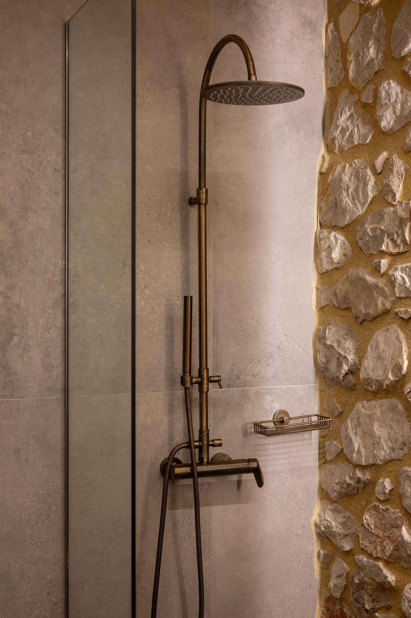 Two bedrooms, one on the ground floor and one in the loft, meet the needs of families or groups while preserving privacy and distinct character. The ground floor bedroom stands out for its warmth and traditional charm, enriched with modern touches that add finesse and brightness. The loft features a minimalist and atmospheric decor with rattan and metal accents, creating a serene space for relaxation and reflection, while the skylight brings the sky inside, allowing natural light to fill the room.